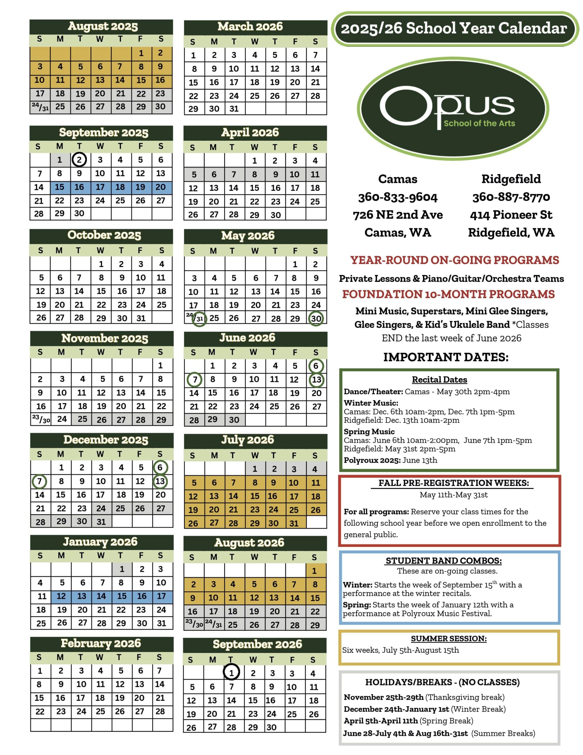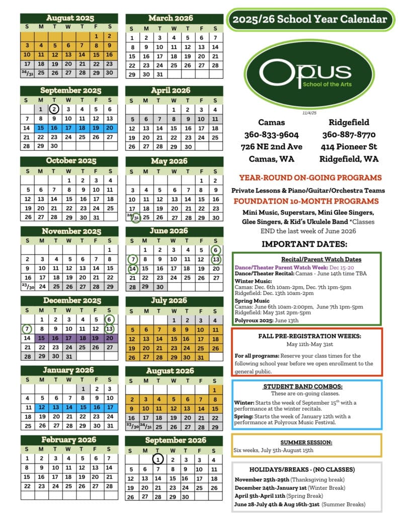OPUS SCHOOL YEAR CALENDAR – Vancouver Ridgefield Camas WA